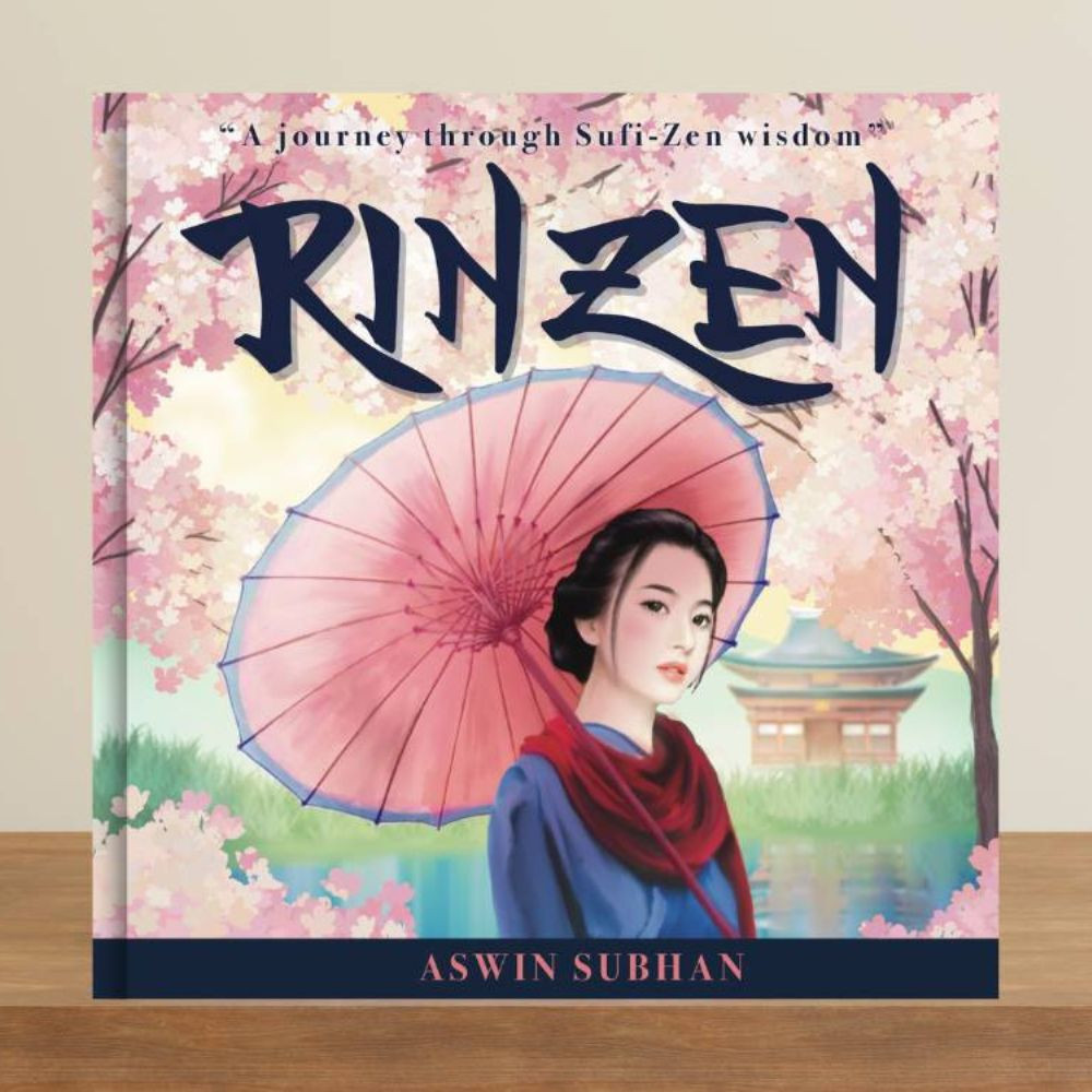The cover design visually represents Rinzen’s pursuit of wisdom. The bold, handwritten title blends Chinese brushstrokes with Arabic characters, reflecting the Zen and Sufi influences that shape the narrative.